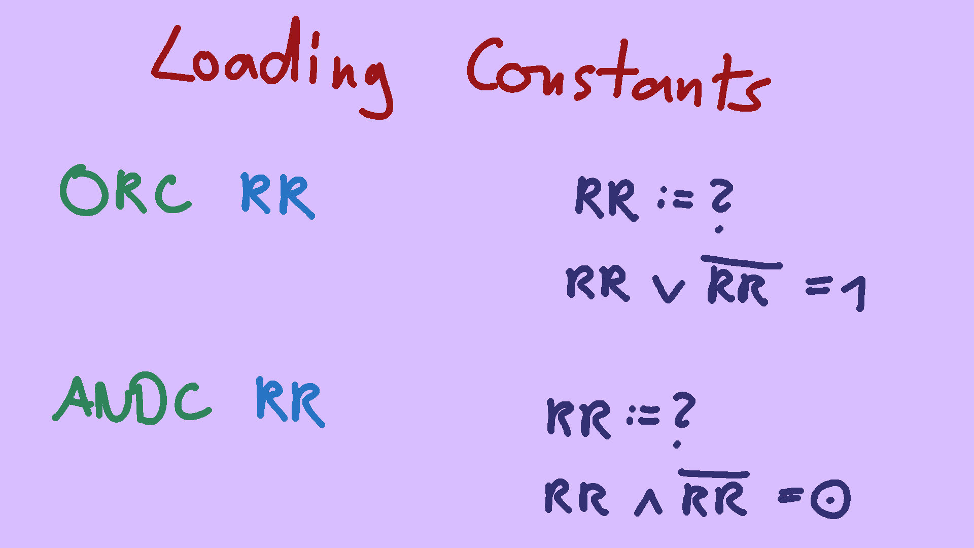 The LoaD instruction can only read from the data bus, there is no load-immediate variant of it available. So how do you load a constant? You could do what many modern architectures do and implement a zero-register with some logic gates. A zero register is a memory location that is read-only and always returns a known value, most of the time, zero. To load a constant one, you could use the LoaD-Complement of zero. But that wastes a precious memory location. You'll most likely have just sixteen addresses, and need every single one. And there is a better, more idiomatic, way. First of all, there are only two possible constants for a one-bit CPU: zero and one. If you take the logical OR of a random value and that value's inverse, you'll always get a one - independent of what was stored in RR beforehand. If RR contained a zero, we'd have zero OR one; if RR already stores a one, this does a one OR zero. We can apply a very similar trick to get a zero: take any random value, and AND it with its complement.