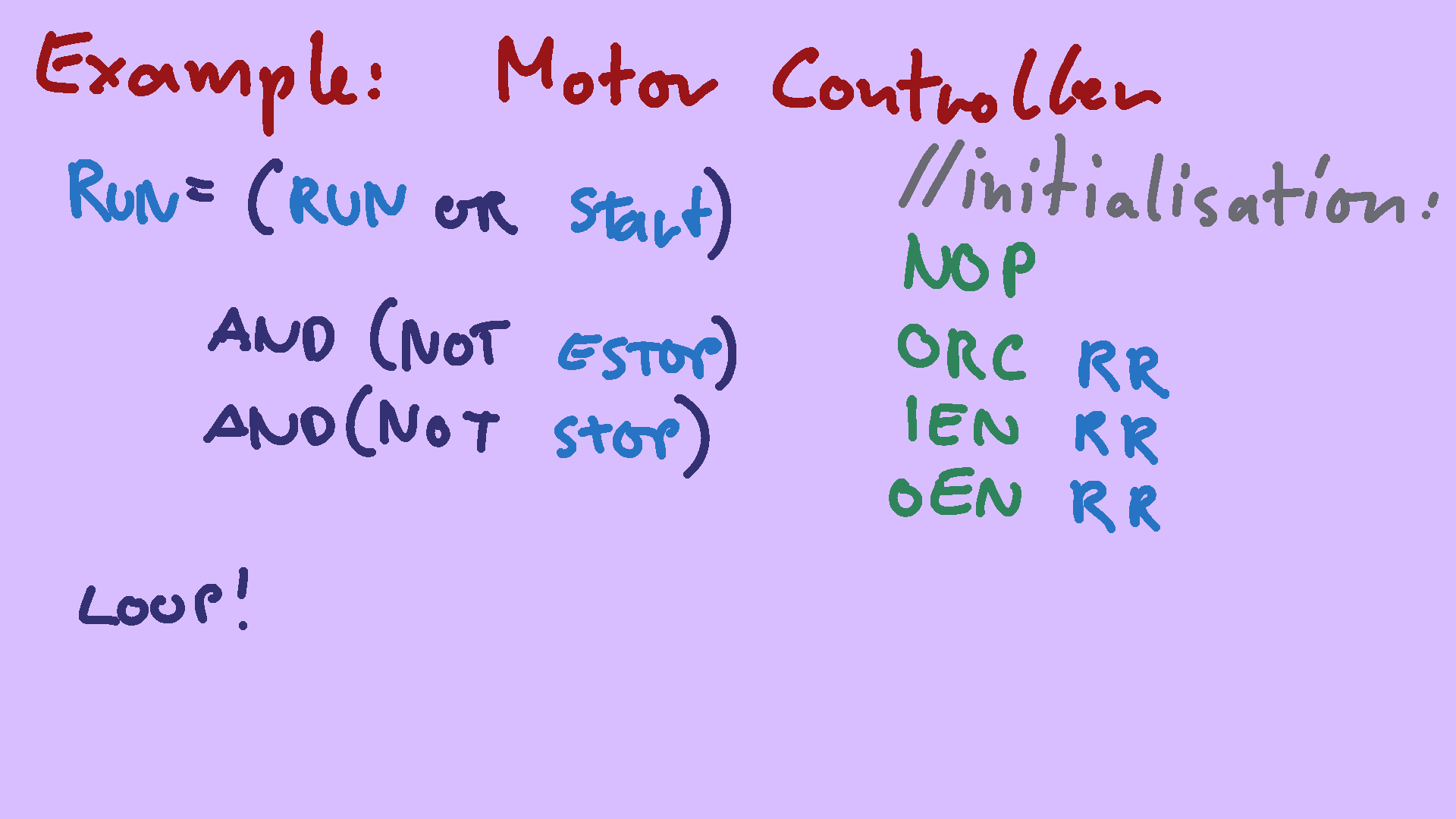 Finally, let's look at some realistic work. Let's say we want to create a motor controller for some industrial equipment. Since it's the nineteen-seventies, we've been given a ladder logic diagram of what our controller should do. Remember, this is exactly the use-case the 14500 was meant to replace. There is a normally-closed emergency stop button, a normally-closed regular stop button, and a normally open start button. if we press start, there is a complete connection from the source at the left, to the drain at the right, and the RUN signal gets turned on. The run signal also doubles as an additional input that keeps the circuit going once we let go of the run button. if we press the stop or e-stop button, the signal gets interrupted, and RUN turns back off, stopping our motor. you can think of that like the above equation is executed at every cycle through the program, which updates the RUN variable constantly.