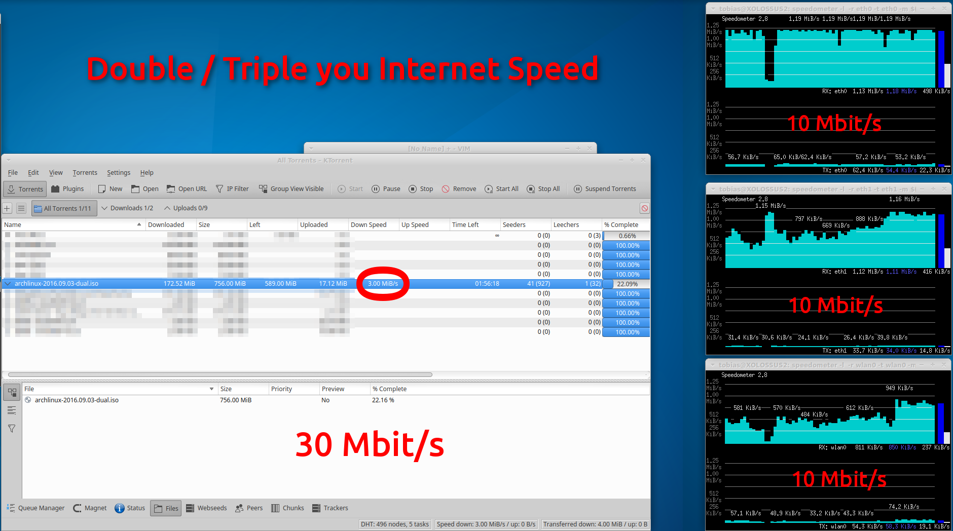 eth0 goes to my Uni’s Interweb (they are my ISP)eth1 is connected via a USB-Ethernet-adapter to a router with a UMTS-modemwlan0 is my Android phone in tethering modeAs you can see, it is of course necessary, that you have multiple entry points into the Internet. If you connect your PC with multiple connections to the same WAN, you won’t get any speed increase.