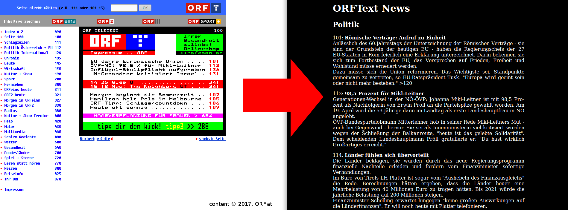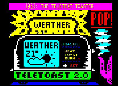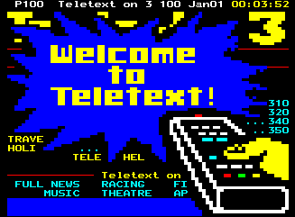 For those not in the know: Teletext, invented by the BBC in 1972/1974, is a digital signal, that puts a 40×25, 8 color character grid onto your screen. Rudimentary (pseudo-)graphics in the form of a graphical character set are available too. The information is sorted into pages (often called tables), from 100 to 899, and subpages2.