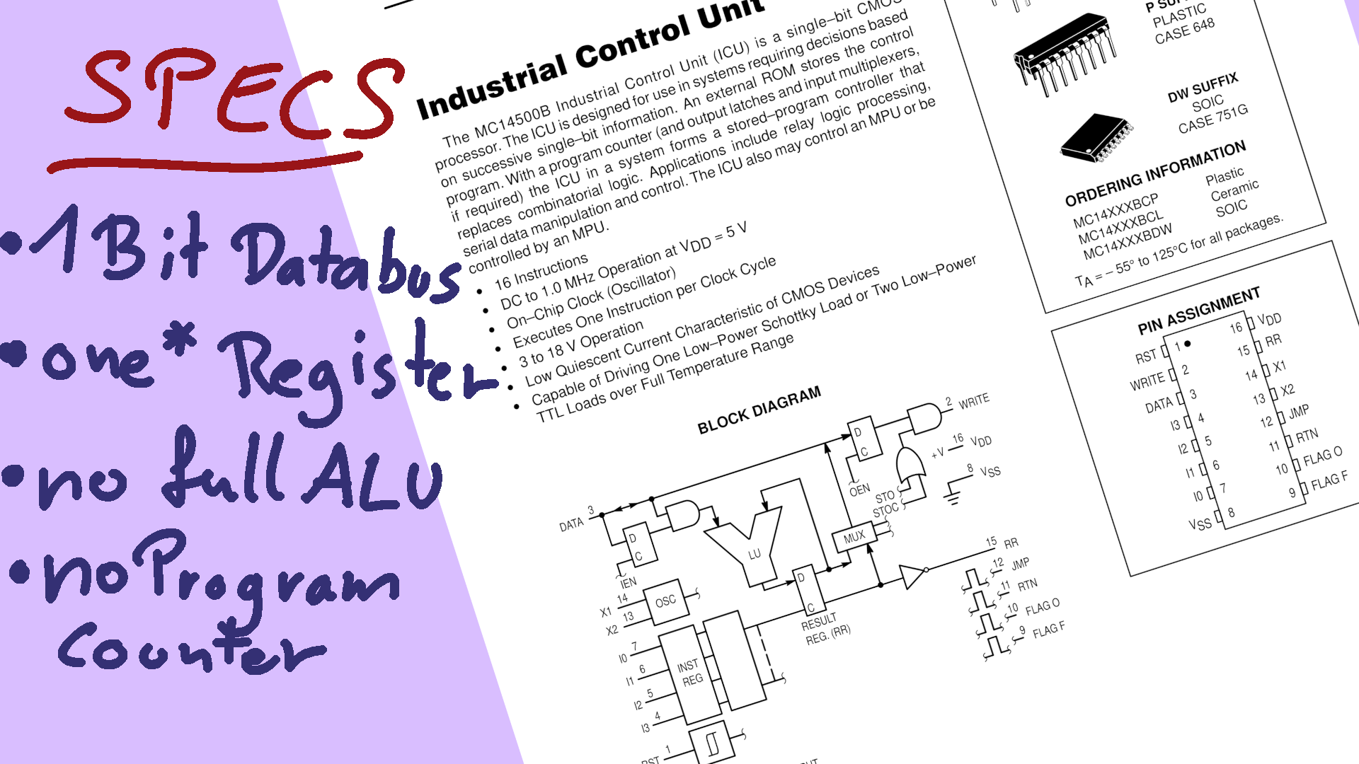 I've always had a bit of an obsession for tiny and/or obsolete microcontrollers. And today I want to tell you all about a long obsolete CPU, with a not 8, not 4, but 1-bit data bus: the Motorola MC14500.