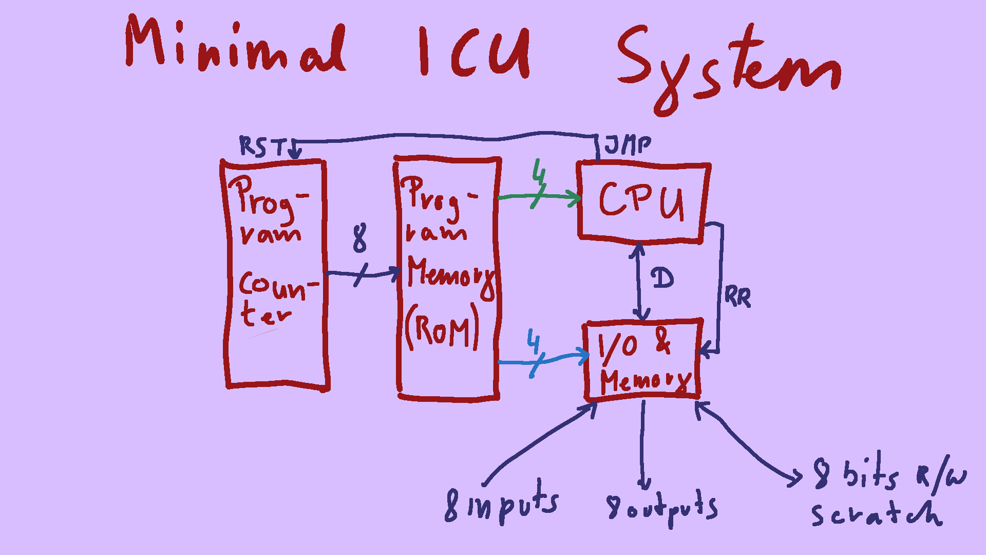 So, that has all been quite theoretical. So let's take a look at what Motorola calls "the minimal ICU system". A lot of what you see online today is essentially (modulo some flourishes) that minimal system. This includes the WDR-eins educational computer from the 1980ies, and the very recent PLC-14500 open hardware project. A PLC, short for programmable logic controller, is essentially an industrial Arduino. It's used to do exactly what the MC14500 was designed to do: automate industrial machinery. It has no control flow, the program simply executes each instruction read from a small RAM chip in sequence, until the program counter overflows, and then starts over. For peripherals, there usually are 8 inputs, 8 outputs, and 8 so-called scratch registers. The scratch registers are simply memory locations you can use to store variables, your RAM so to speak. The lower three bits of the address bus are hooked up to all three peripherals. The highest address bit then selects between the GPIO and the scratch registers. And to differentiate between inputs and outputs, the CPU's write signal is used. If you execute a STORE, it goes to the outputs, if you execute a LOAD it goes to the inputs. This way you essentially have read-only inputs, and write-only outputs.