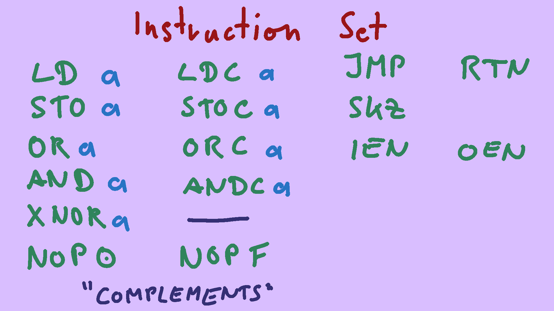 But first, let's take a quick look at the instruction set of the MC14500. It starts off pretty tame: there's LoaD, STOre, OR, AND. These do exactly what you'd expect from them: they all take one operand, and the other is implicitly the result register, i.e., the accumulator. Instead of XOR you get XNOR, the exclusive-NOR instruction, which is essentially an equality check. So far so good, but what is missing though is a NOT or INVERT instruction. Instead, most of these instructions come in pairs: For example, OR-Complement takes a bit from the data bus, inverts it, and then ORs it with the result register. This means that you'll have to rearrange your formulas quite a bit on paper until they can be implemented. deMorgan is your friend. then, there are JuMP, ReTurN, and SKip-if-Zero instructions for flow control; more on them later. IEN and OEN stand for Input-ENable and Output-ENable, they are an alternative way to do flow-control. Again, more on that later.