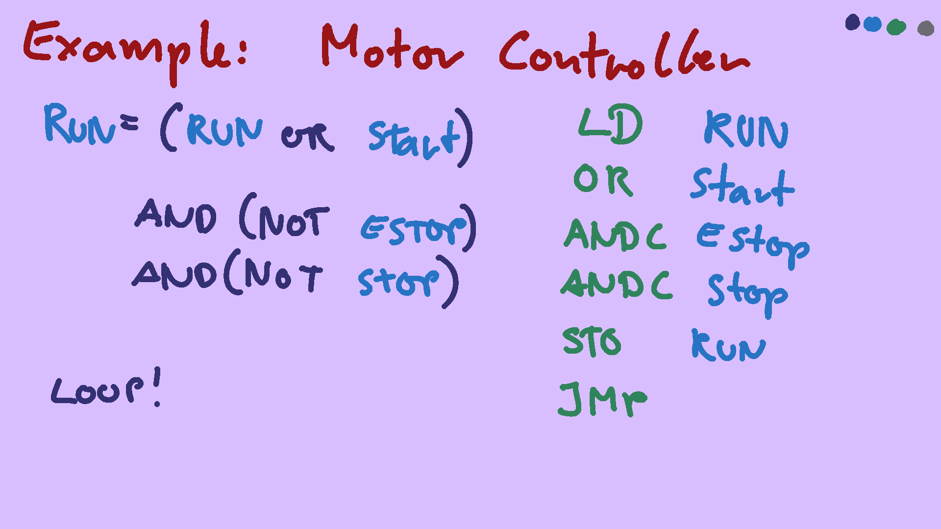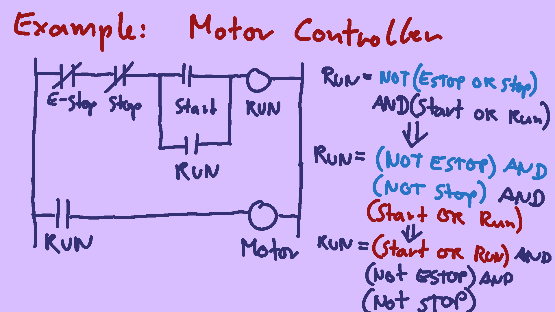 Finally, let's look at some realistic work. Let's say we want to create a motor controller for some industrial equipment. Since it's the nineteen-seventies, we've been given a ladder logic diagram of what our controller should do. Remember, this is exactly the use-case the 14500 was meant to replace. There is a normally-closed emergency stop button, a normally-closed regular stop button, and a normally open start button. if we press start, there is a complete connection from the source at the left, to the drain at the right, and the RUN signal gets turned on. The run signal also doubles as an additional input that keeps the circuit going once we let go of the run button. if we press the stop or e-stop button, the signal gets interrupted, and RUN turns back off, stopping our motor. you can think of that like the above equation is executed at every cycle through the program, which updates the RUN variable constantly.