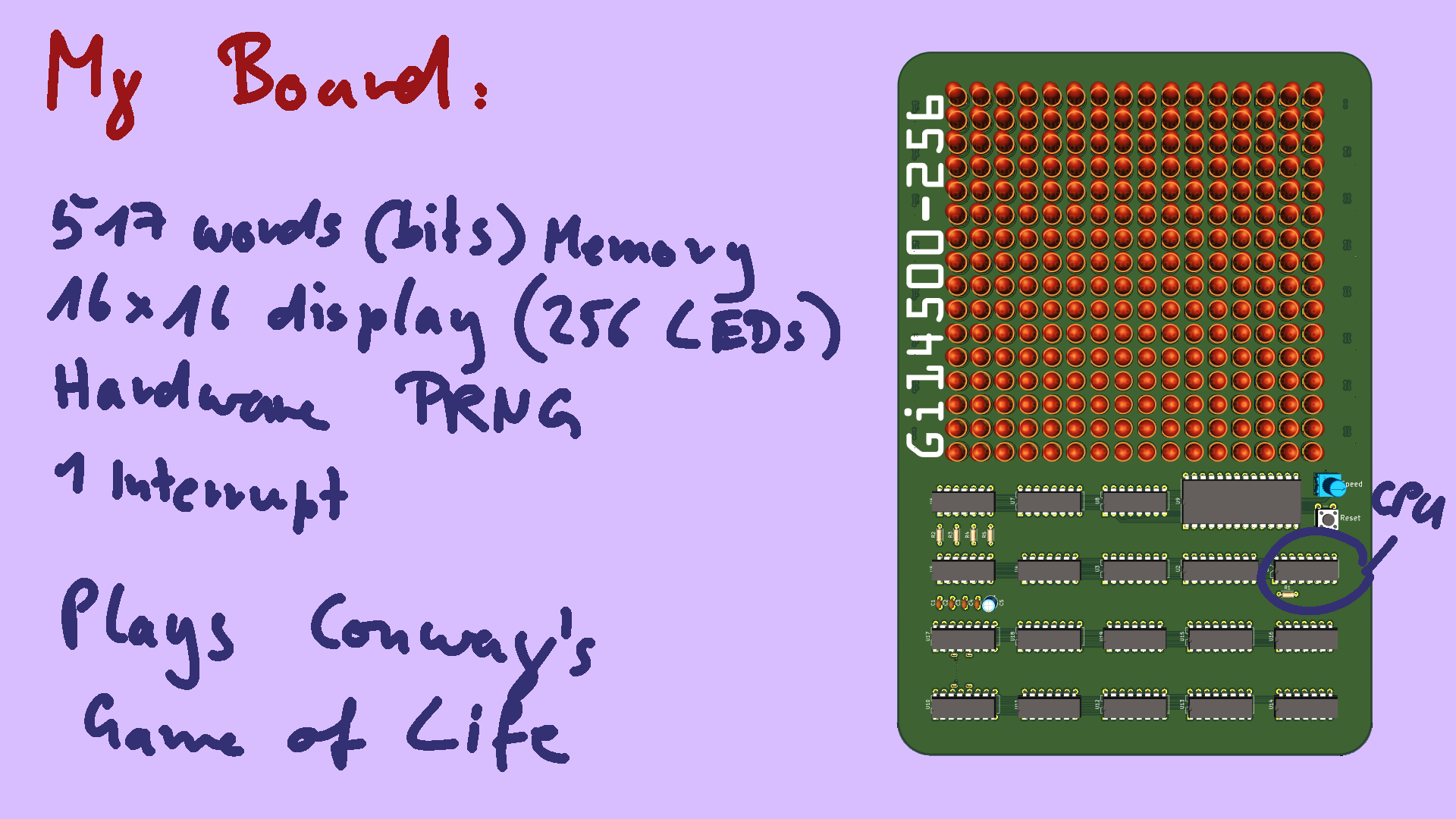 Let's switch gears, and talk about the thing I built. I claim this is the most powerful 14500 project to date: it has 517 words of memory, a 16x16 double-buffered display, a hardware random number generator, and even has an interrupt of sorts. I call it the GI-14500. The 256 suffix is the number of LEDs on the board.