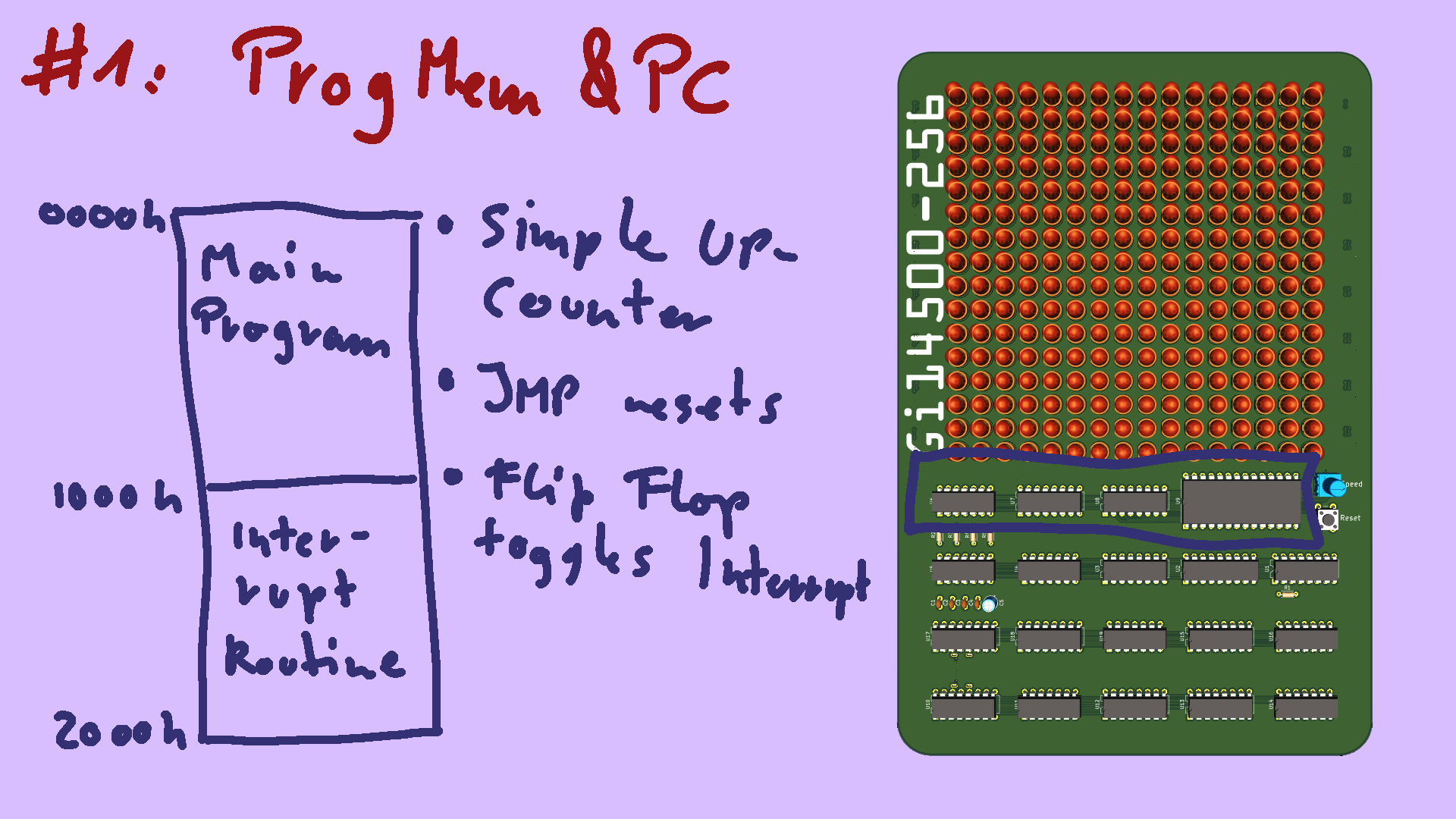 The first is the program memory and program counter unit. It's made up of a simply binary counter, directly attached to the lower half of EEPROM storing our machine code. The upper half of program memory is reserved for the interrupt routine. if this flip-flop is triggered, it simply swiches out the normal program for the interrupt routine, and vice versa. As with the minimal ICU system, JUMP simply resets the counter to zero, looping the program back to the beginning. the RETURN instruction additionally clears the flip-flop, returning from the interrupt, and starting the main program again.