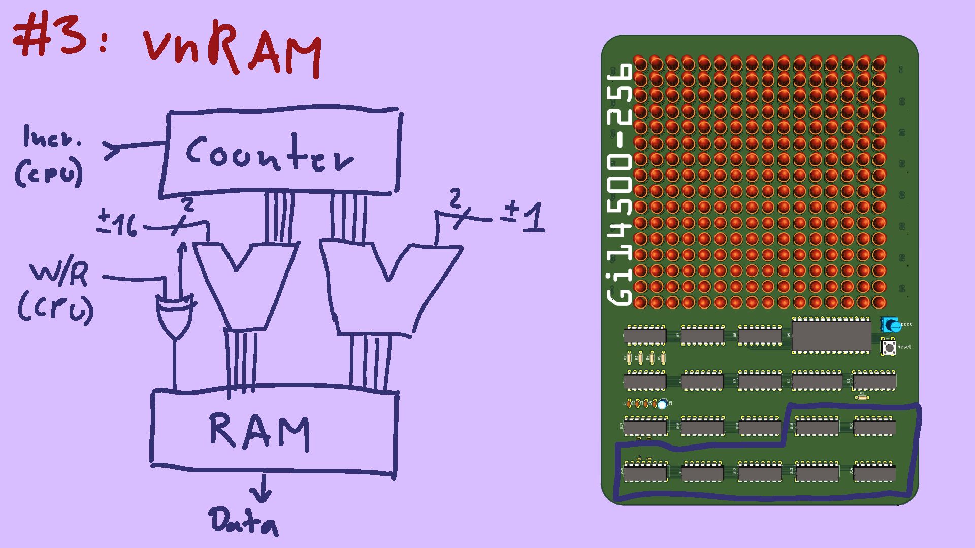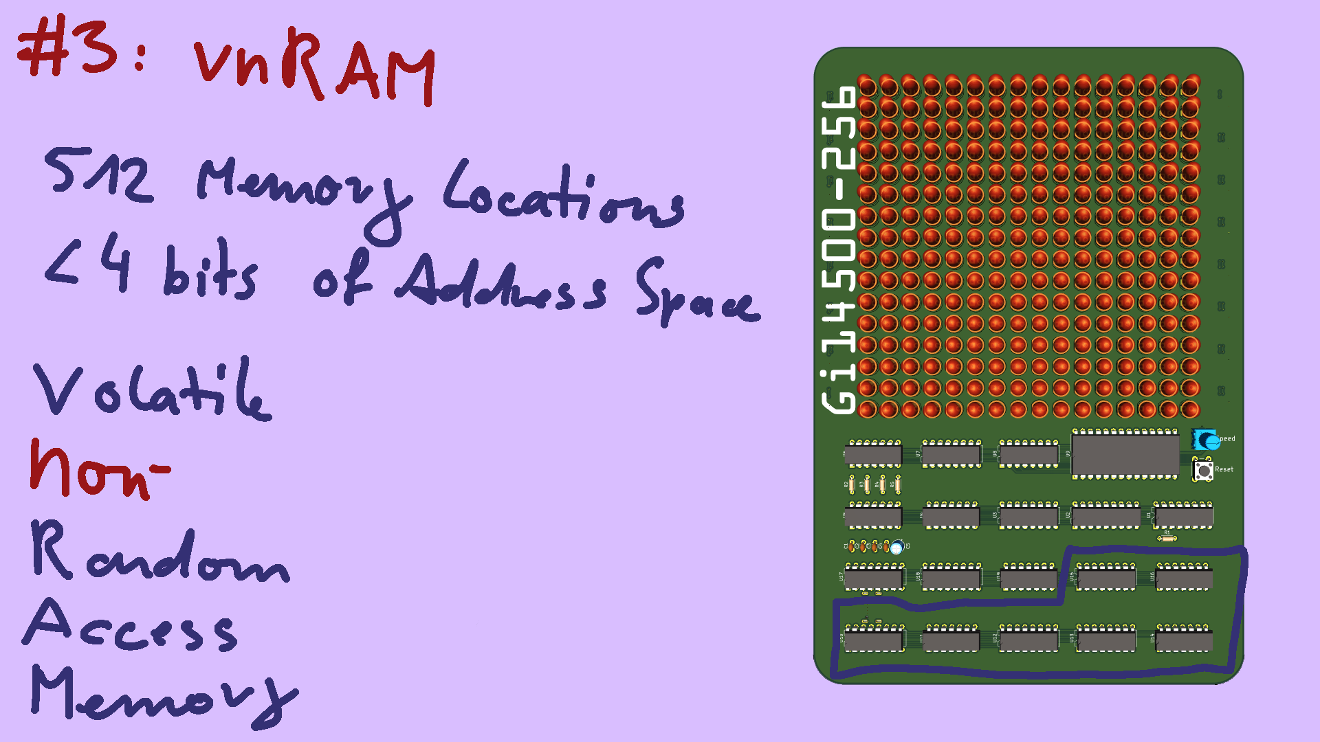 Now let's talk about the main attraction: the 512 bits of memory. As teased in the abstract, I only have 4-bits of address space - that's 16 different memory addresses in total. And we already used up seven of them for the result register, random number generator and registre bank. So how can I access two-to-the-power-of-nine bits of memory, with less than four addressl ines? well, i promosed I'll tell you: it's memory, but it's not randomly accessible - RAM - memory. I'm calling it vnRAM - volatile non-randomly accessible memory. It's a pun of nvRAM, which is RAM that retains its contents after the power is turned off. The basic idea is pretty simple: the address lines of an ordinary RAM chip are not hooked up to the CPU, but to a binary counter, like the program counter, but for RAM. This counter is incremented only when the CPU tells it to - using one of the NOP FLAG output pins of the 14500. This way, we can step through all 512 bits of memory, and when we want to read the next value, strobe the FLAG pin to increment the counter.