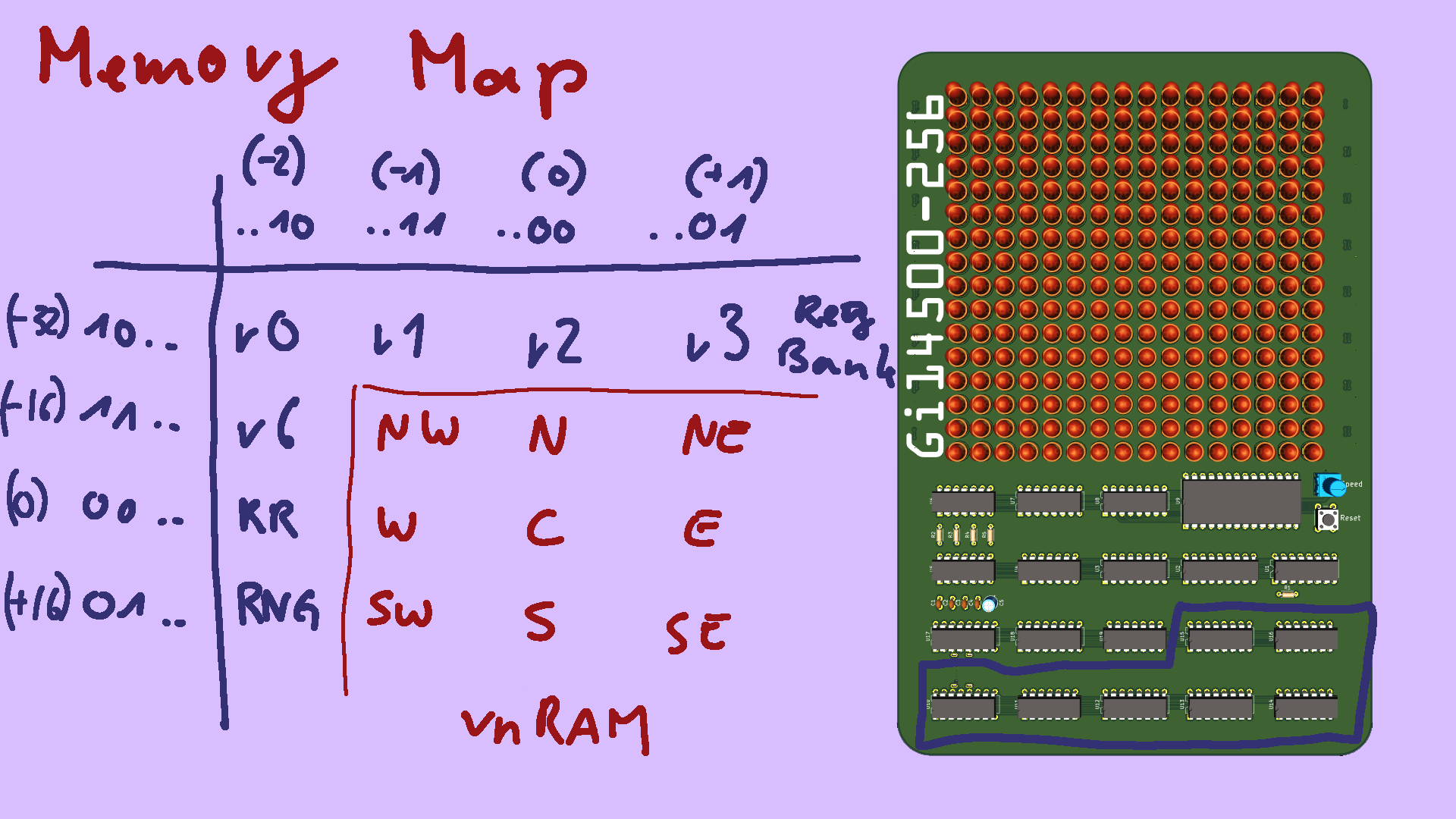 For this, the actual address lines are connected to a pair of full adder chips. Memory location zero simply passes through unmodified and returns the memory cell indicated by the counter. But by asking for other memory addresses, we can change the input of the adders and access the neighbouring fields. There's one more trick: when the CPU writes to memory using the STOre instruction, it puts a signal out on the Write pin. This is nothing special - all CPUs do that - it's necessary so the memory knows that it needs to store the value presented, instead of returning what's already there. But we can make use of this, to invert one of the address lines of the RAM chip. This means whenever one page of memory is opened for reading, writes go to the other. This gives us double-buffering for the cost of just a single XOR gate! pretty neat. With this setup, you could actually implement any graphics filter that uses a 3x3 kernel (well, at a measly bit-depth of 1, so no grayscale, just black or white). The schematic I've put up on screen is of course a simplification. There are some additional gates needed to make subtraction work, or so that reading a non-existent neighbour on the edge of the screen doesn't result in garbage data. But ... details.