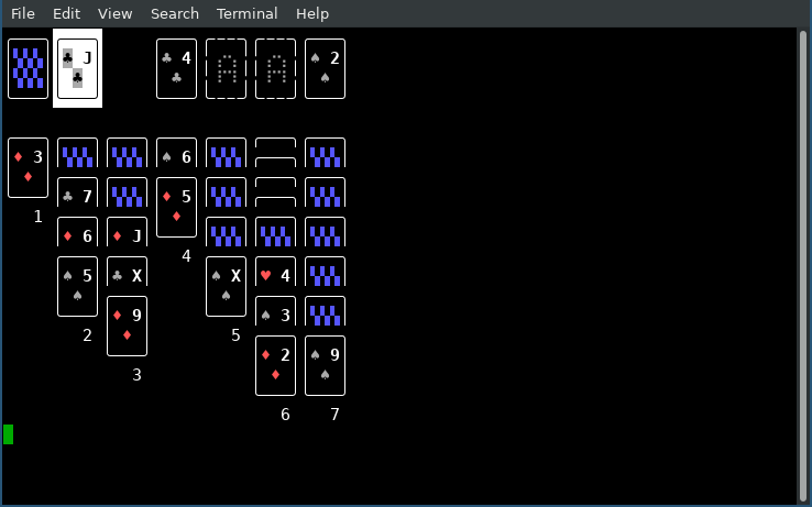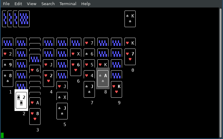 As its name suggests, this is an implementation of the classic solitaire games Klondike, Spider and FreeCell. It has some nice to use vi(1) like keybindings, but can also be played with standard cursor keys, the number pad/row or even the mouse (if your terminal supports that). You can select from three different Unicode character schemes, including a colour one. solVItaire has a very unique join mode (see Keybindings).